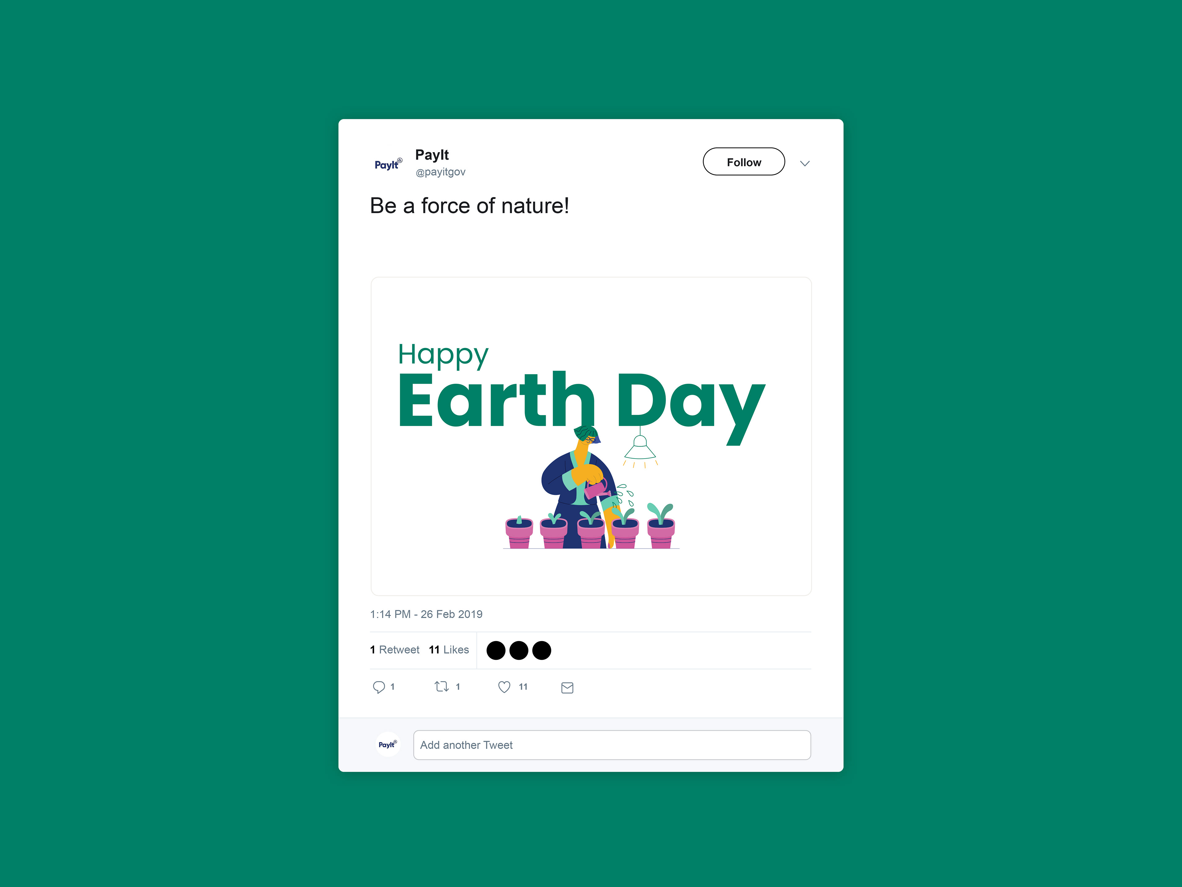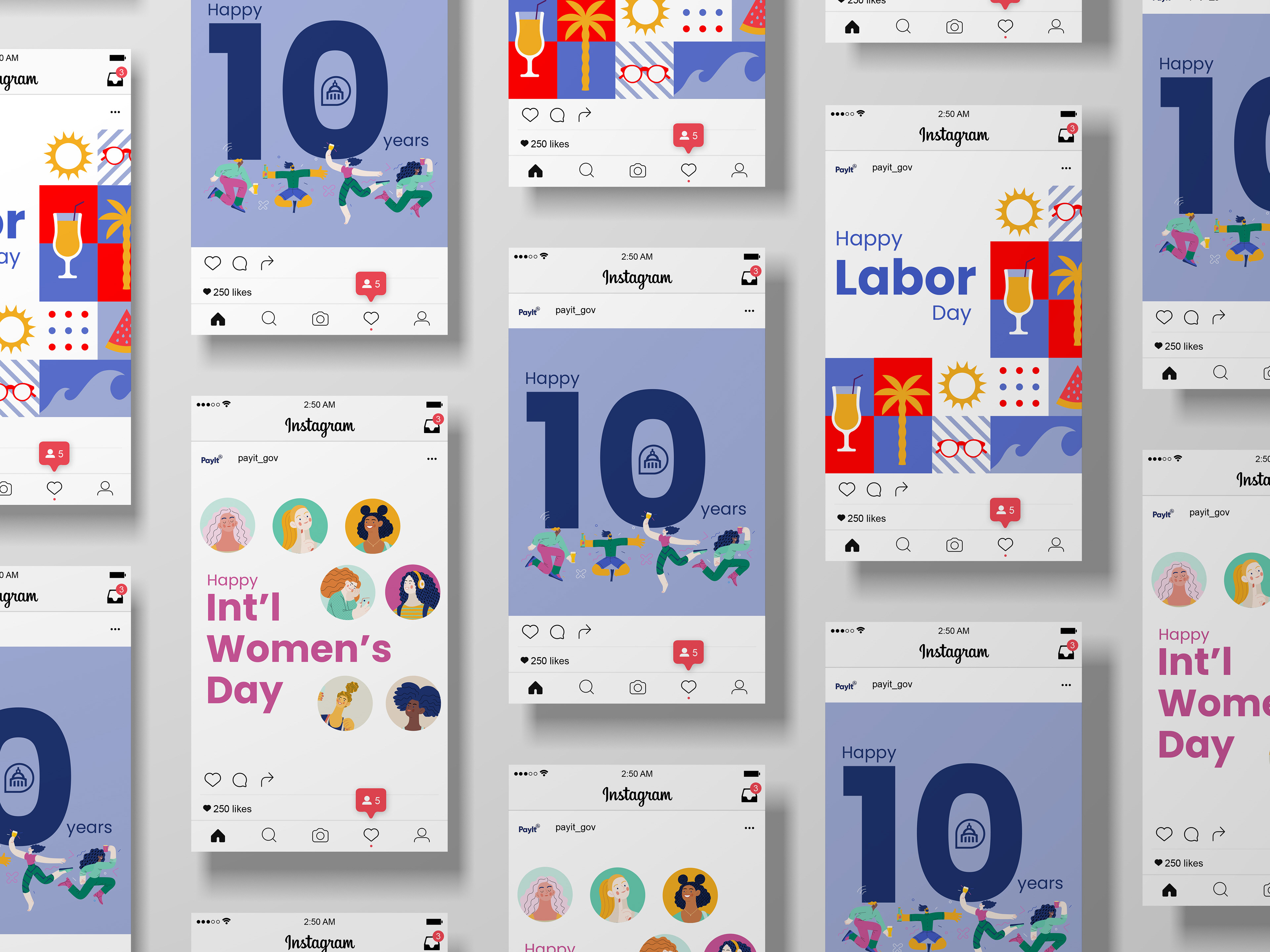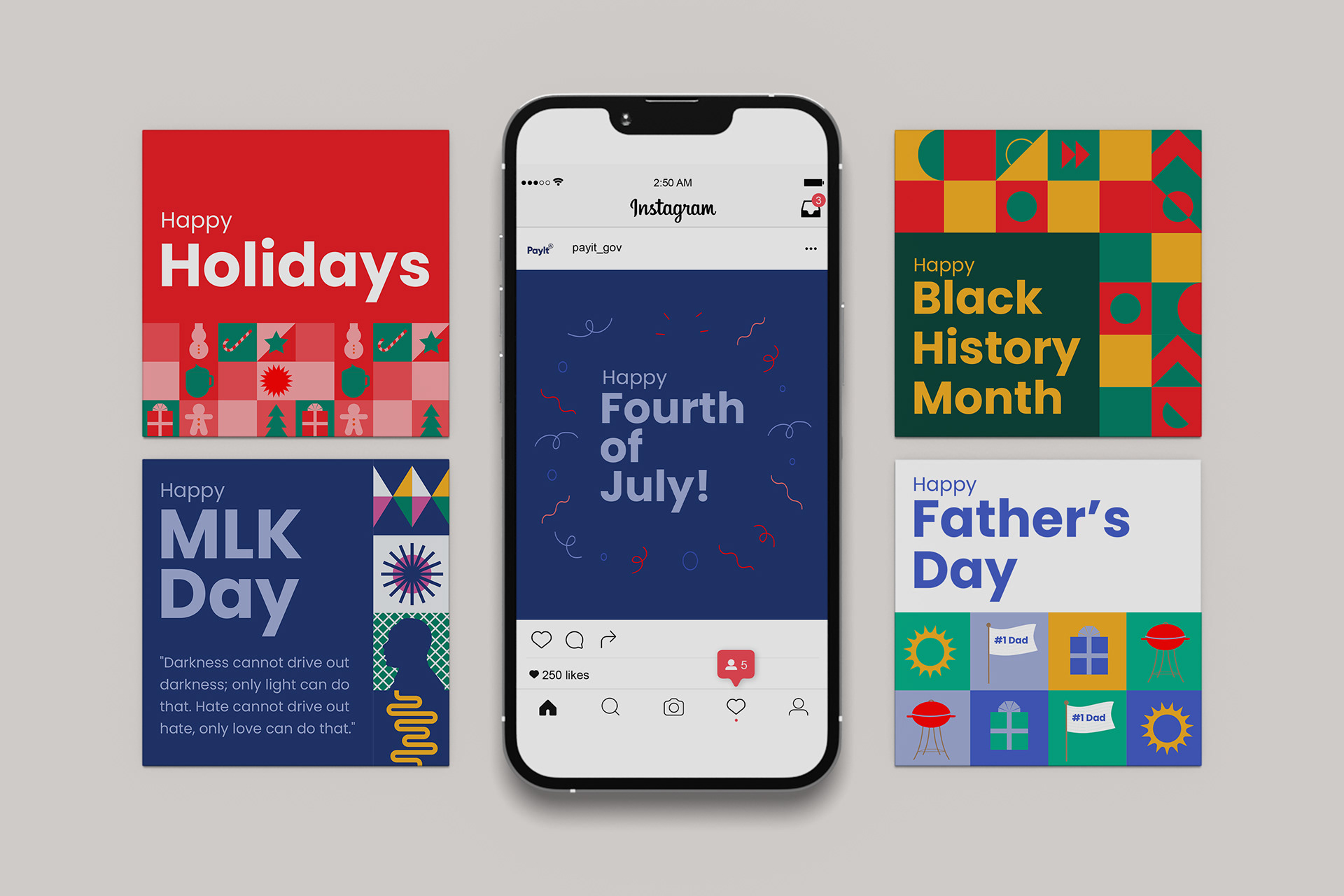PayIt is a government tech company focusing on streamlining online payments for government agencies across the US. Using the existing PayIt branding, a variety of holiday graphics for social media were created. Large type was utilized to bring emphasis to each graphic and bright colors/illustrative elements helped to bring the playful and casual style across. The target audience for this project is PayIt's potential and existing customers, so the graphics had to appeal to a large group of people.